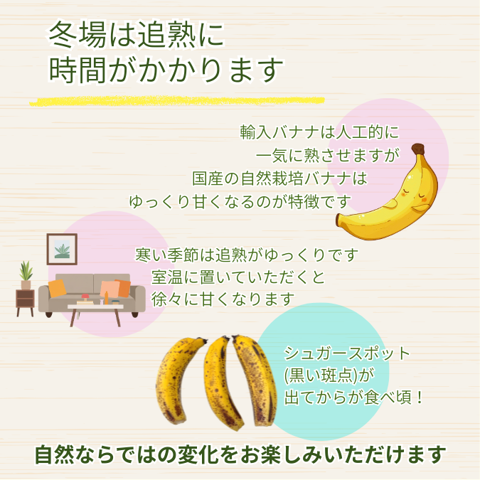 ※配送中に追熟が進み、黄色く色づいたり黒い斑点が出ることがありますが、美味しくお召し上がりいただけますのでご安心ください。