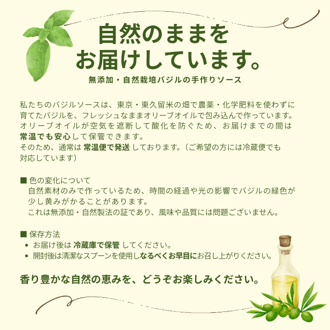 ■自然栽培バジル使用:豊かな香りとやさしい味わい