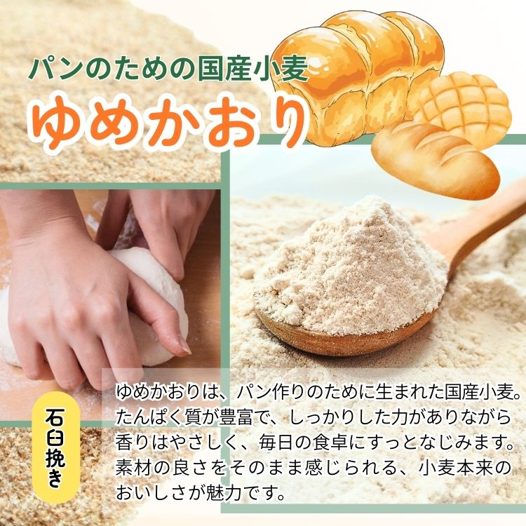 国内でも希少なパン用硬質小麦「ゆめかおり」は、豊富なたんぱく質とグルテンで、 しっとり・もっちり・コシのある生地を実現。食パンはもちろん、ピザや菓子パンにも最適です。