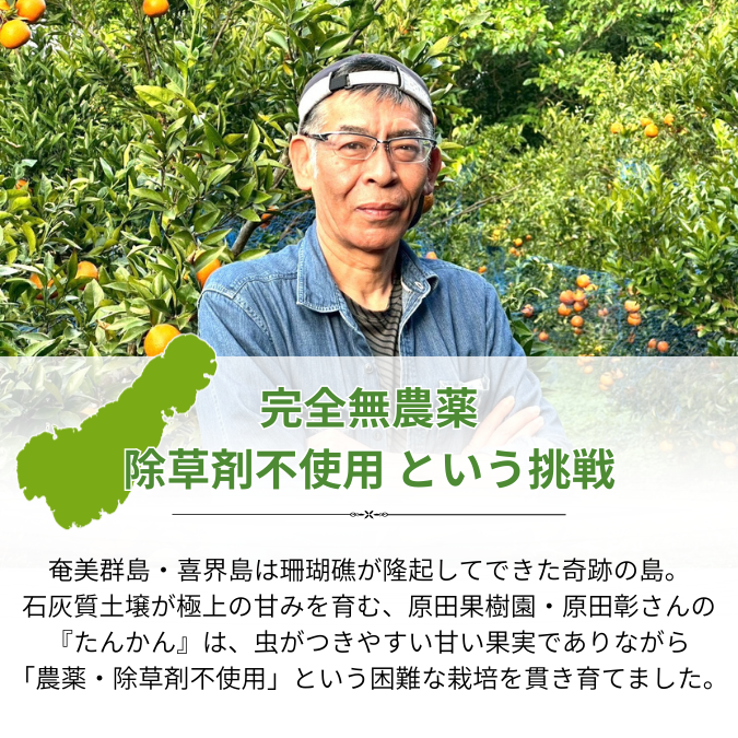 石灰質土壌が極上の甘みを育む、原田果樹園・原田彰さんの『タンカン』は、虫がつきやすい甘い果実でありながら、「農薬・除草剤不使用」という困難な栽培を貫き育てました。